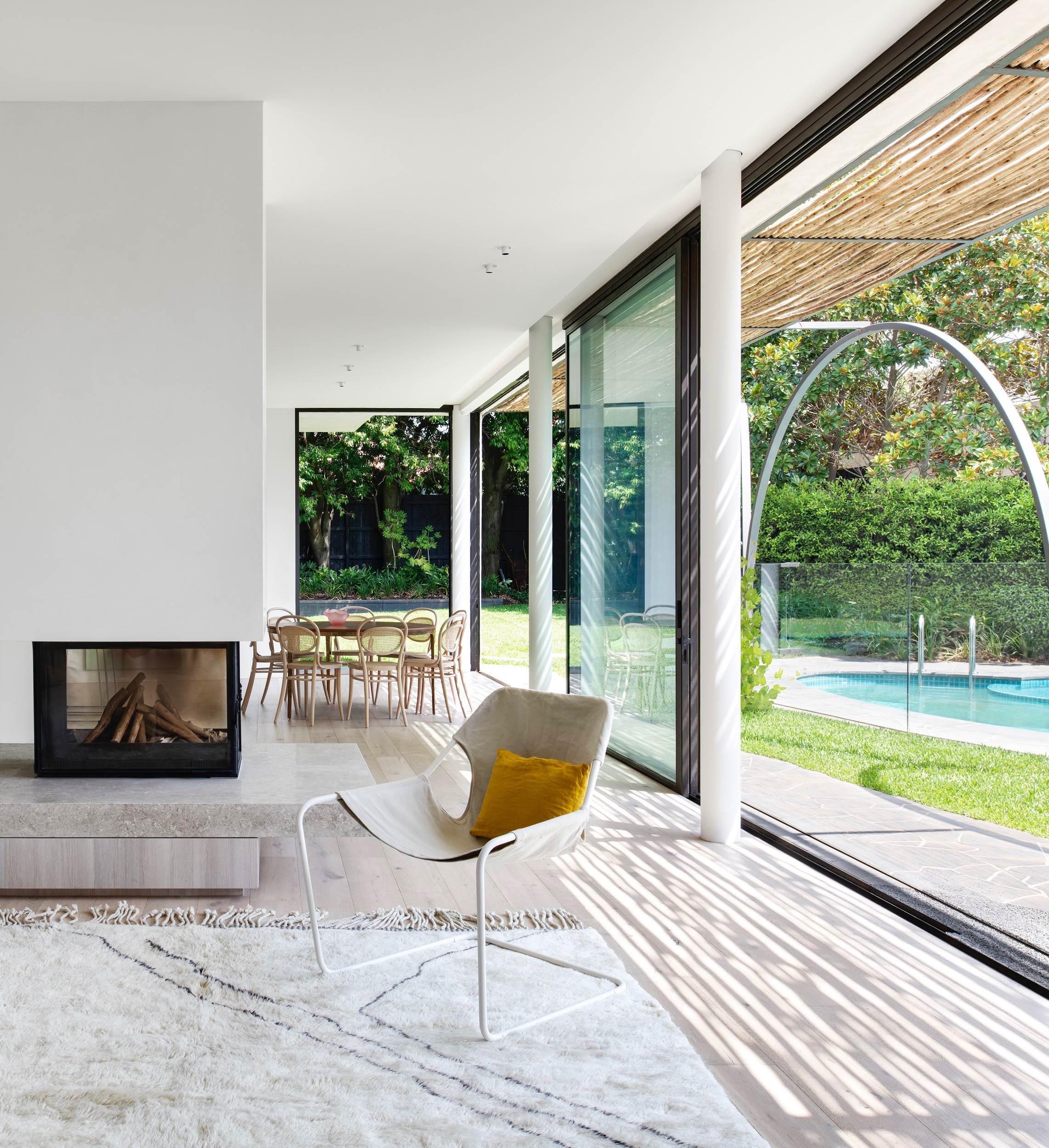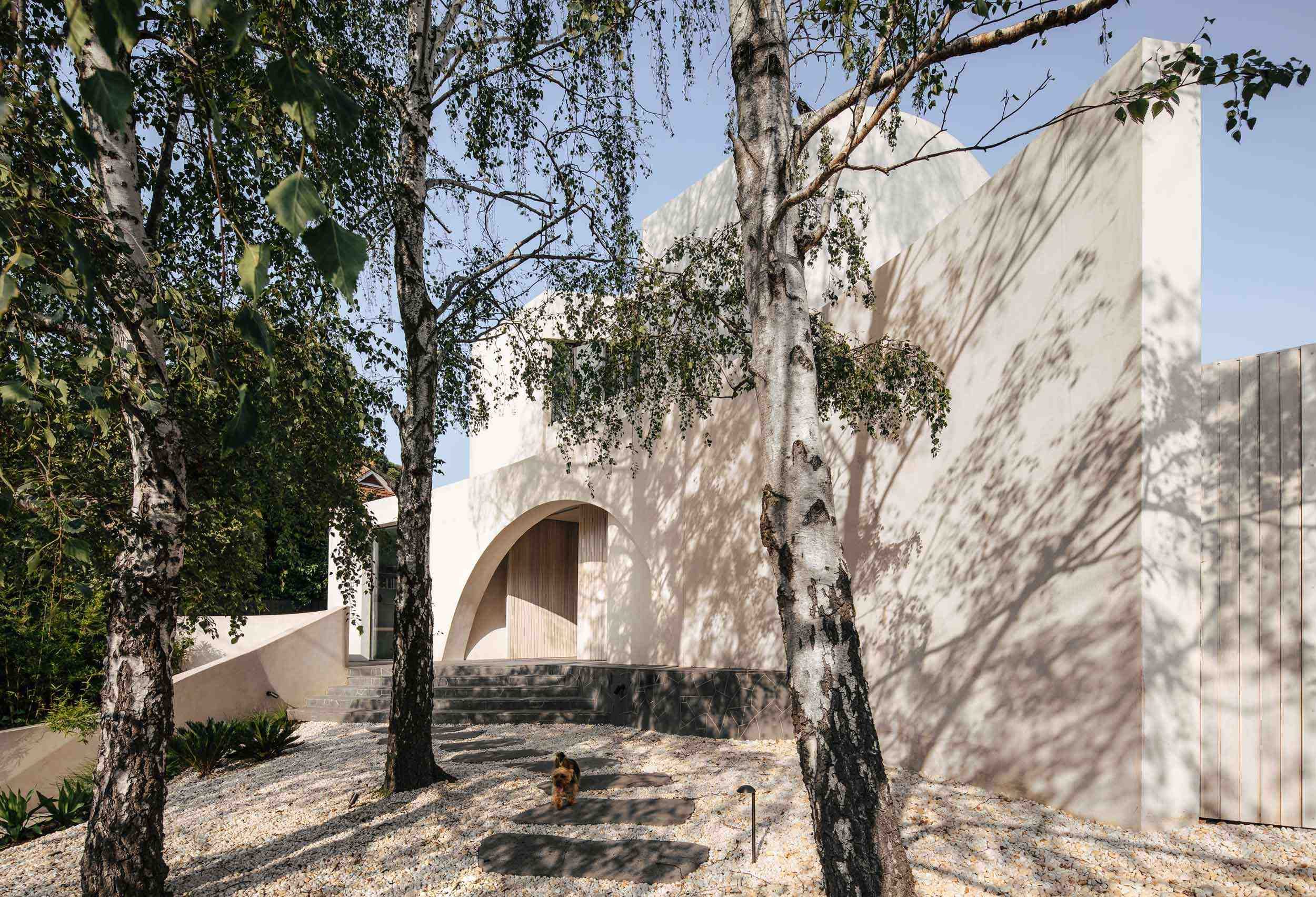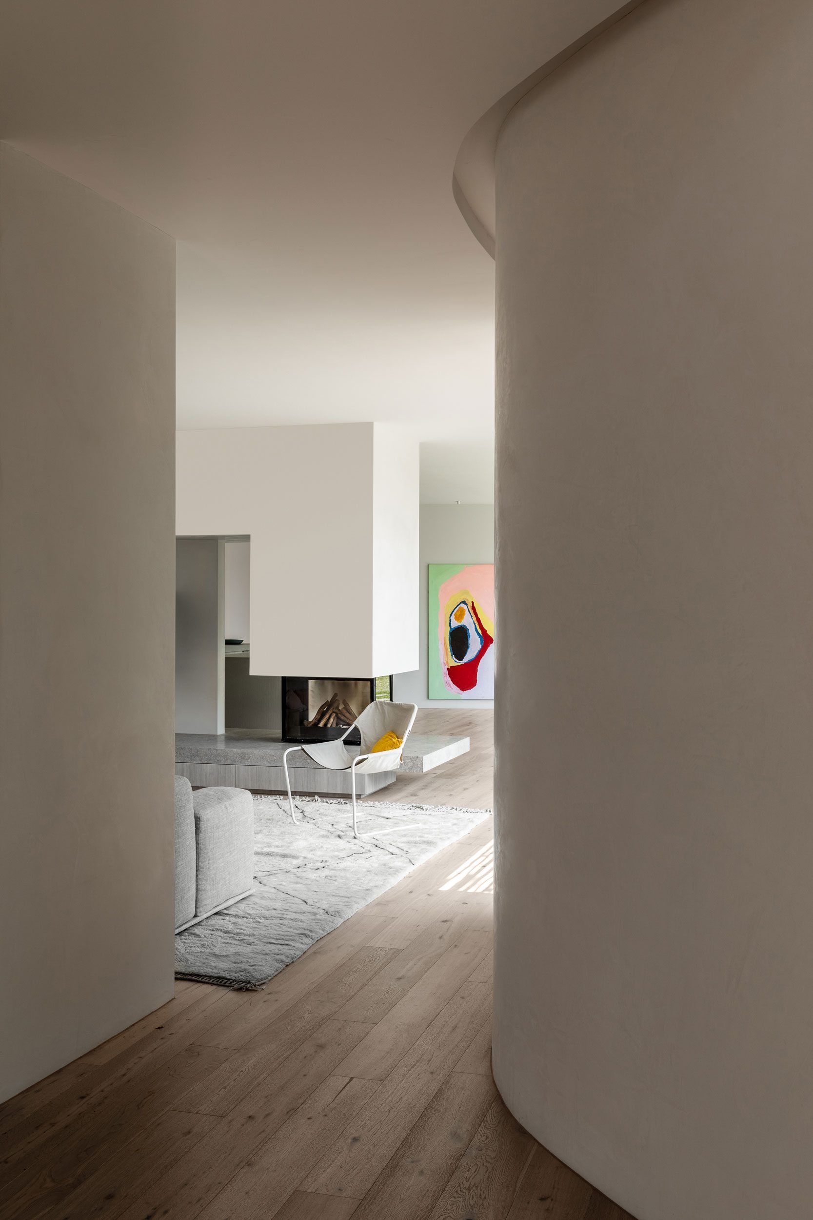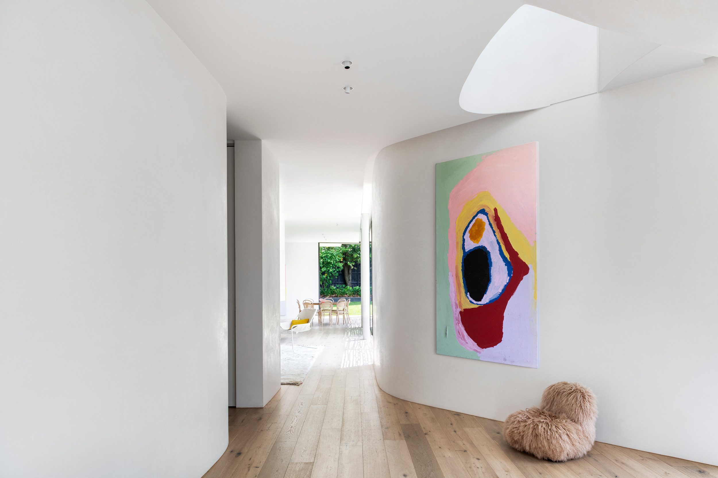 Welcoming, the row of birch trees align the path to the arched entry and oversized door. Our aim for Birch Tree house was to create a gentle sculptural but robust family home set amongst a beautiful restful garden. Internally the house focuses outwards towards the north and a beautiful oval pool. Romantic arches laiden in grapevine blur the boundary between inside and out with large steel sliding doors fully opening to create both a sunny, sheltered haven in winter and summer and all through the year. Soft furnishings and artworks create casual and peaceful spaces. Polished and curved plaster walls throughout, similarly blur the spaces and create the softest palette and flow, as a background for happy family days.