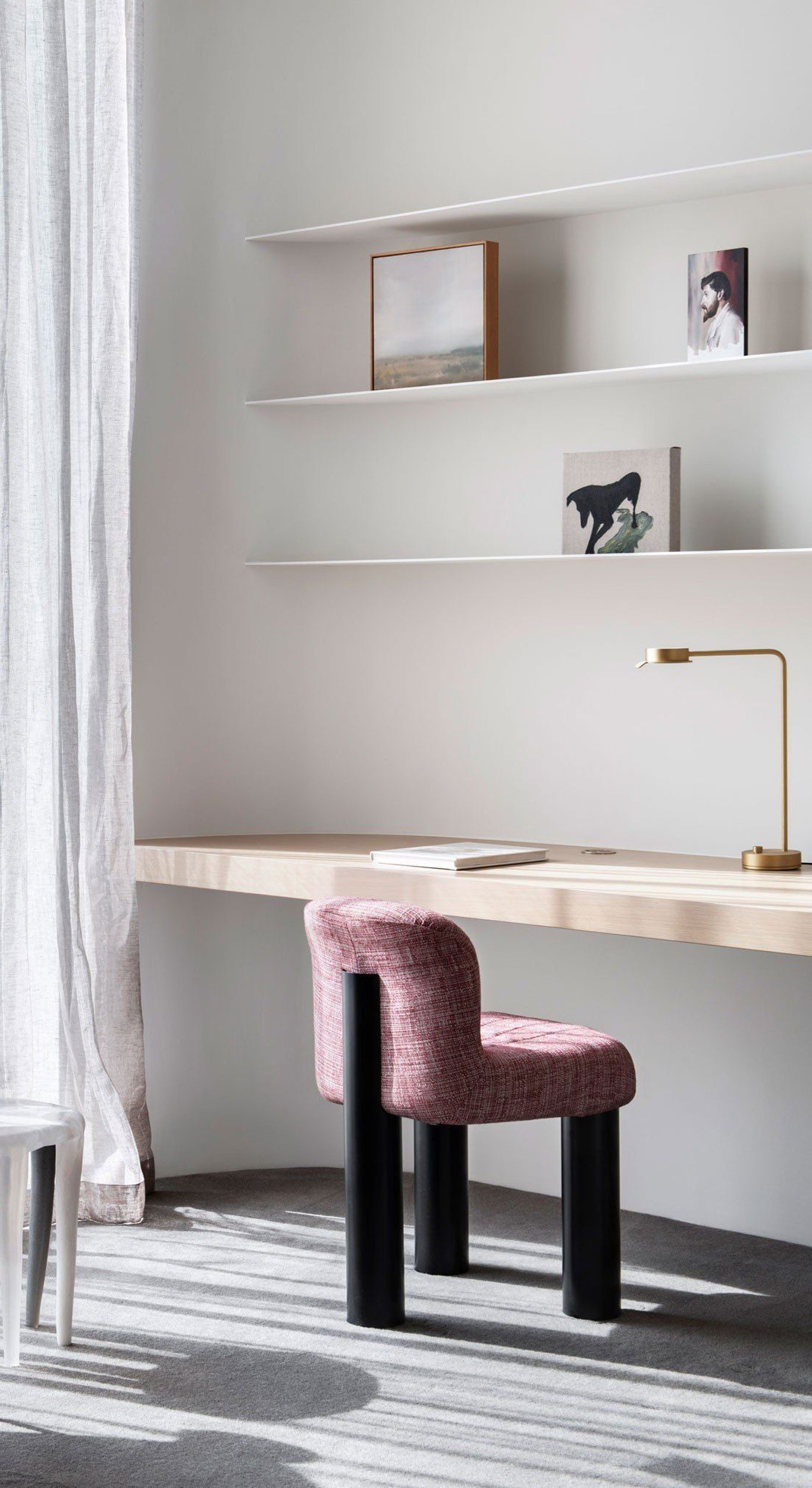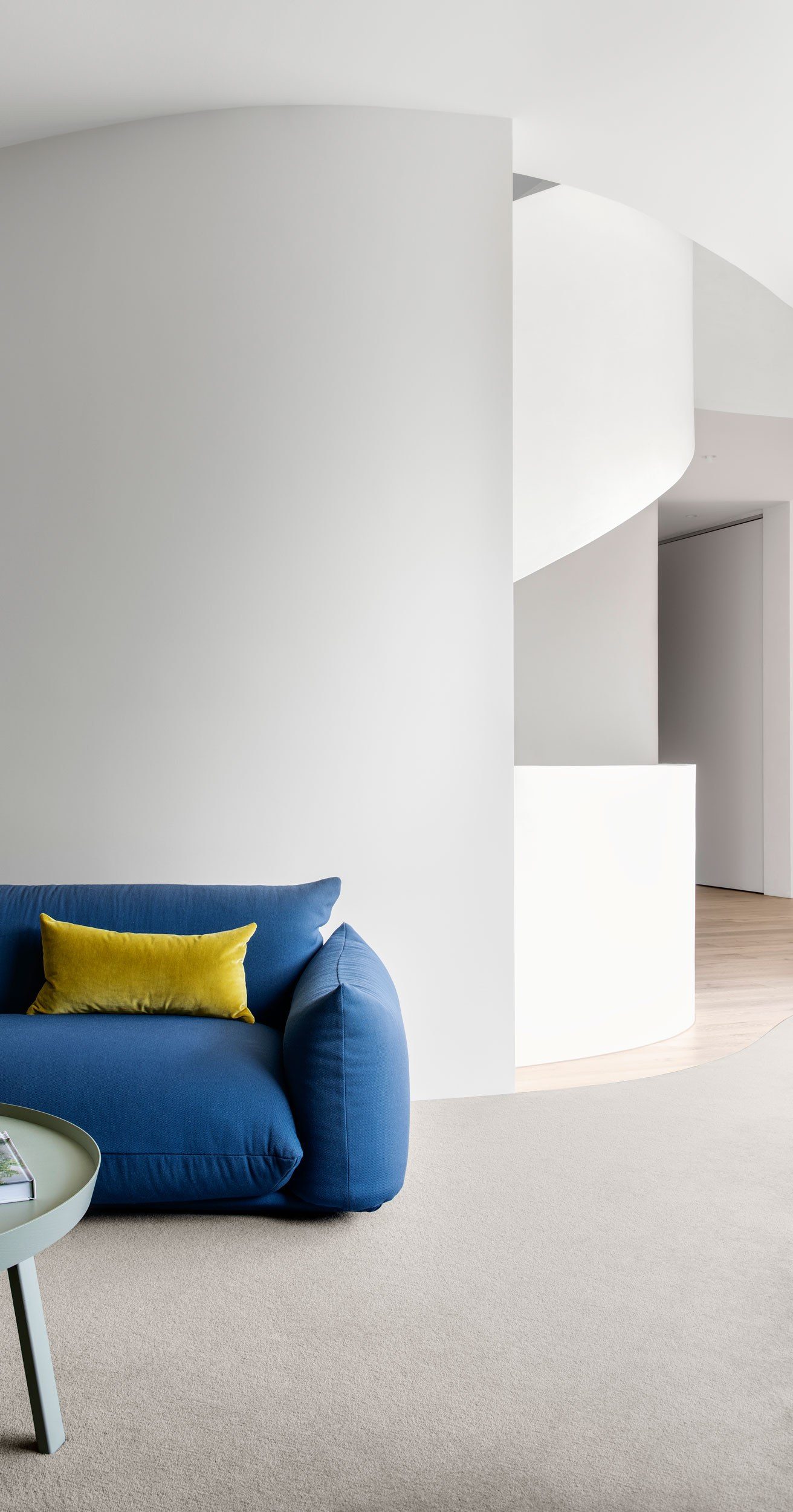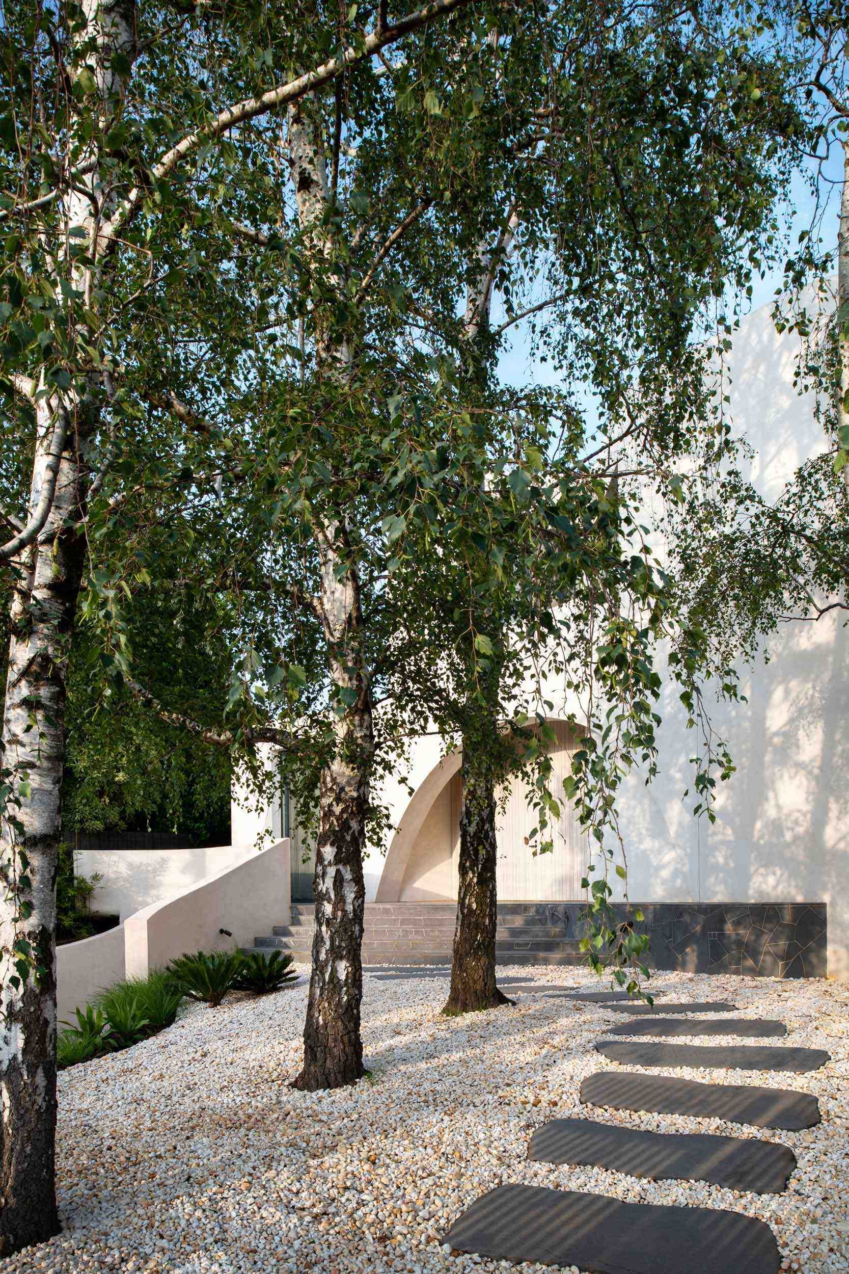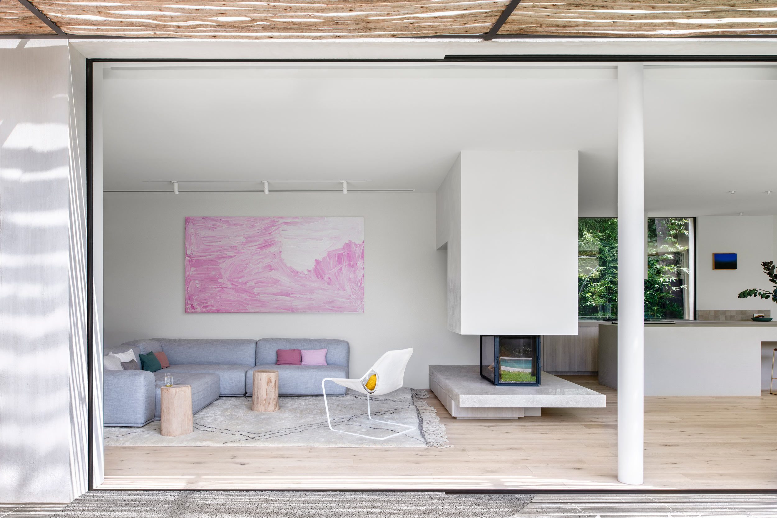 Welcoming, the row of birch trees align the path to the arched entry and oversized door. Our aim for Birch Tree house was to create a gentle sculptural but robust family home set amongst a beautiful restful garden. Internally the house focuses outwards towards the north and a beautiful oval pool. Romantic arches laiden in grapevine blur the boundary between inside and out with large steel sliding doors fully opening to create both a sunny, sheltered haven in winter and summer and all through the year. Soft furnishings and artworks create casual and peaceful spaces. Polished and curved plaster walls throughout, similarly blur the spaces and create the softest palette and flow, as a background for happy family days.