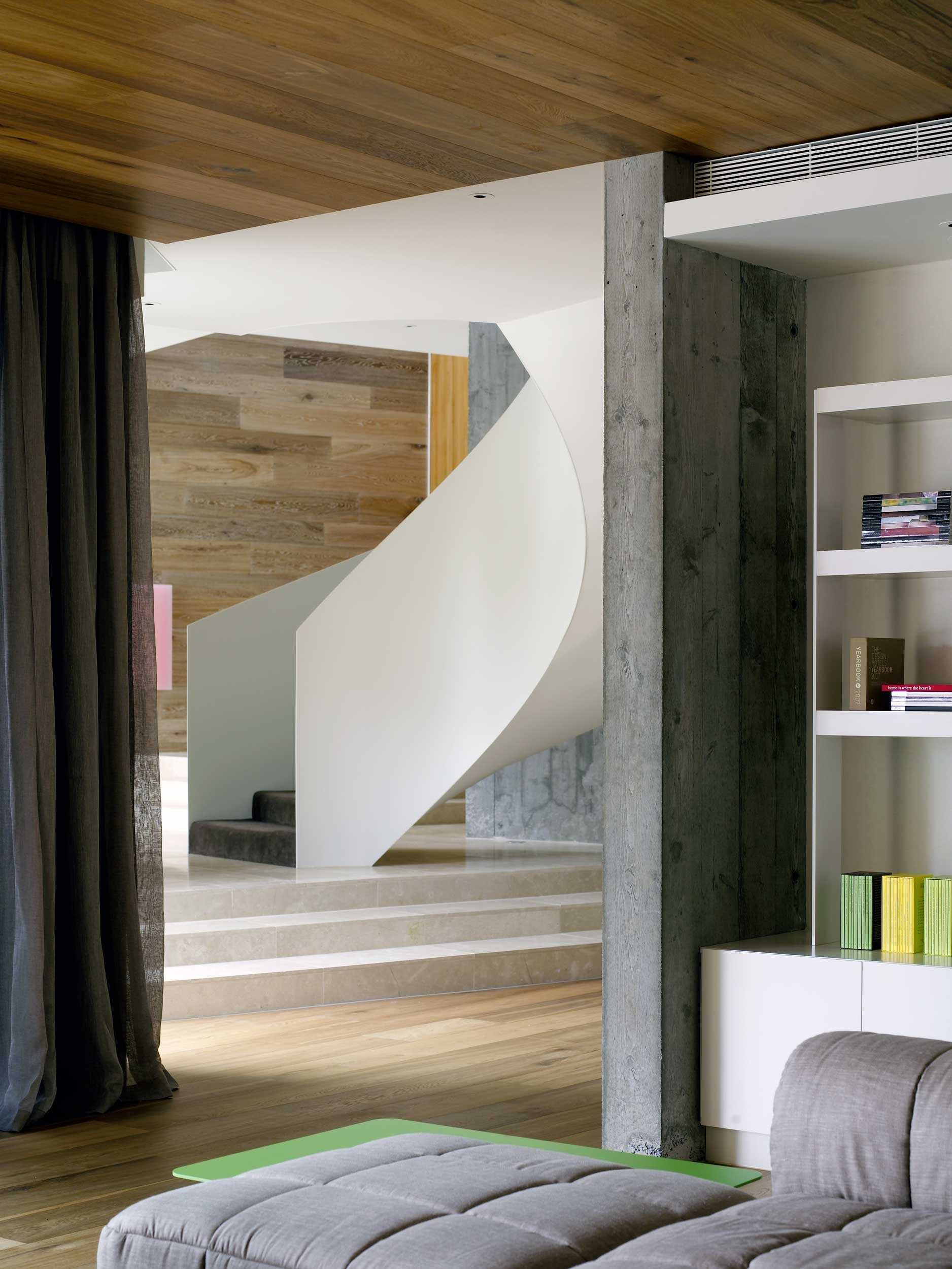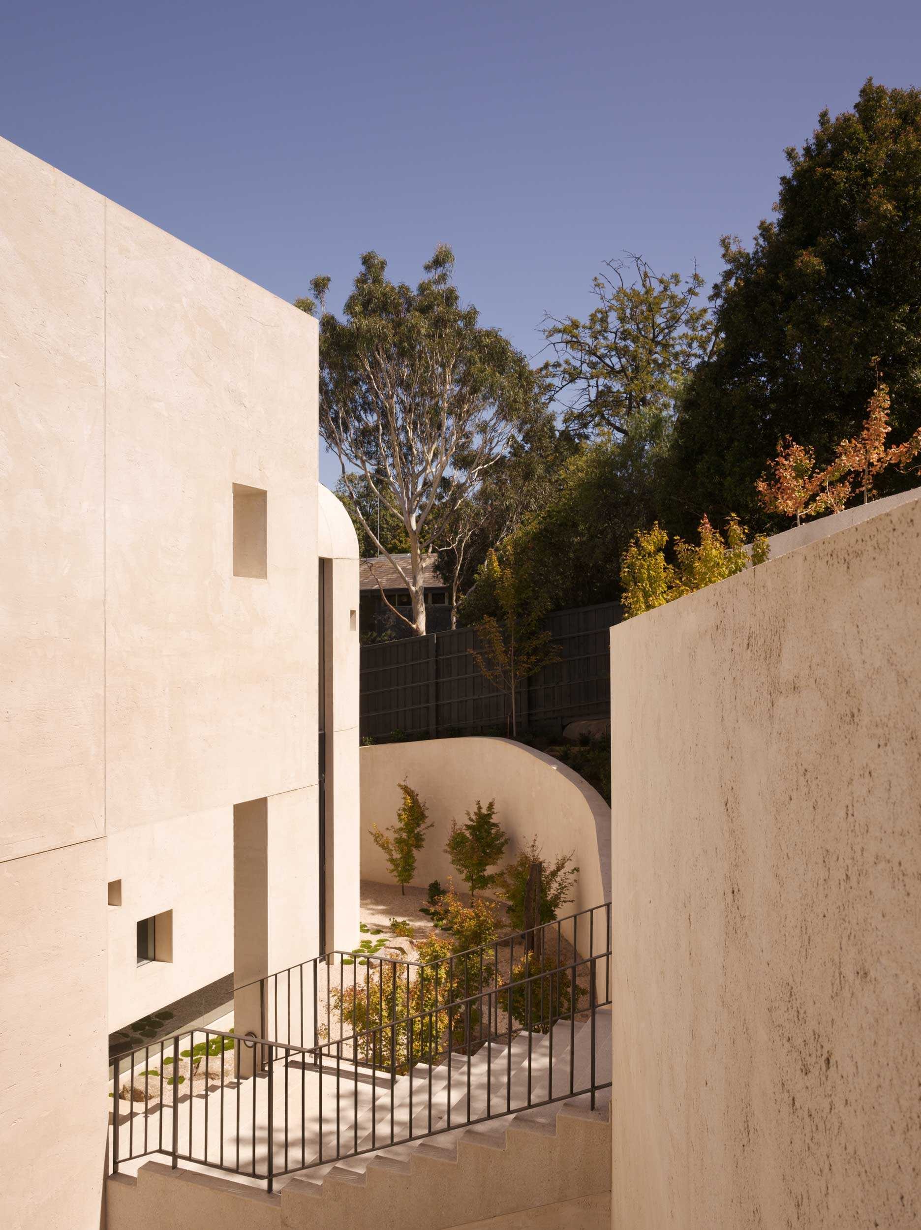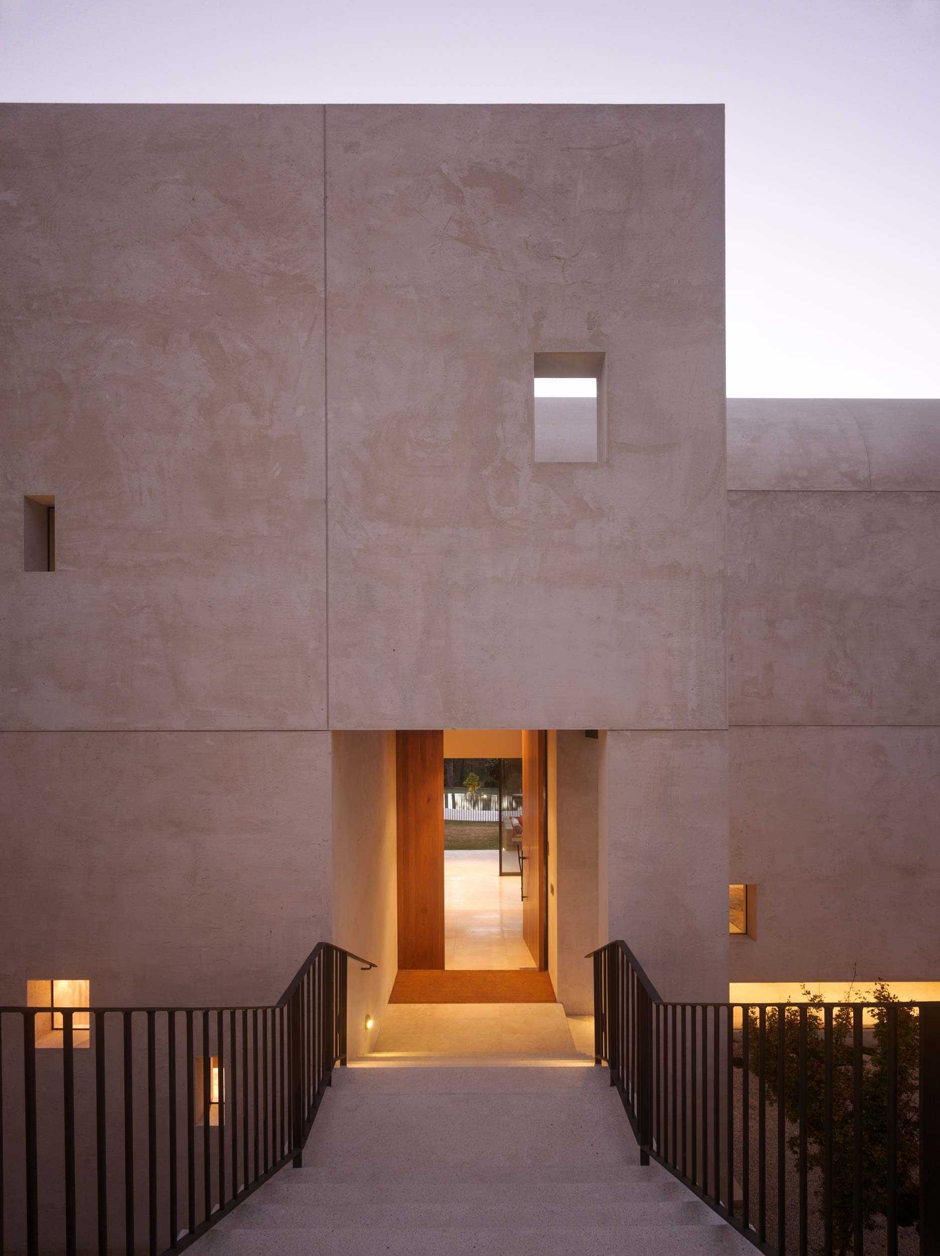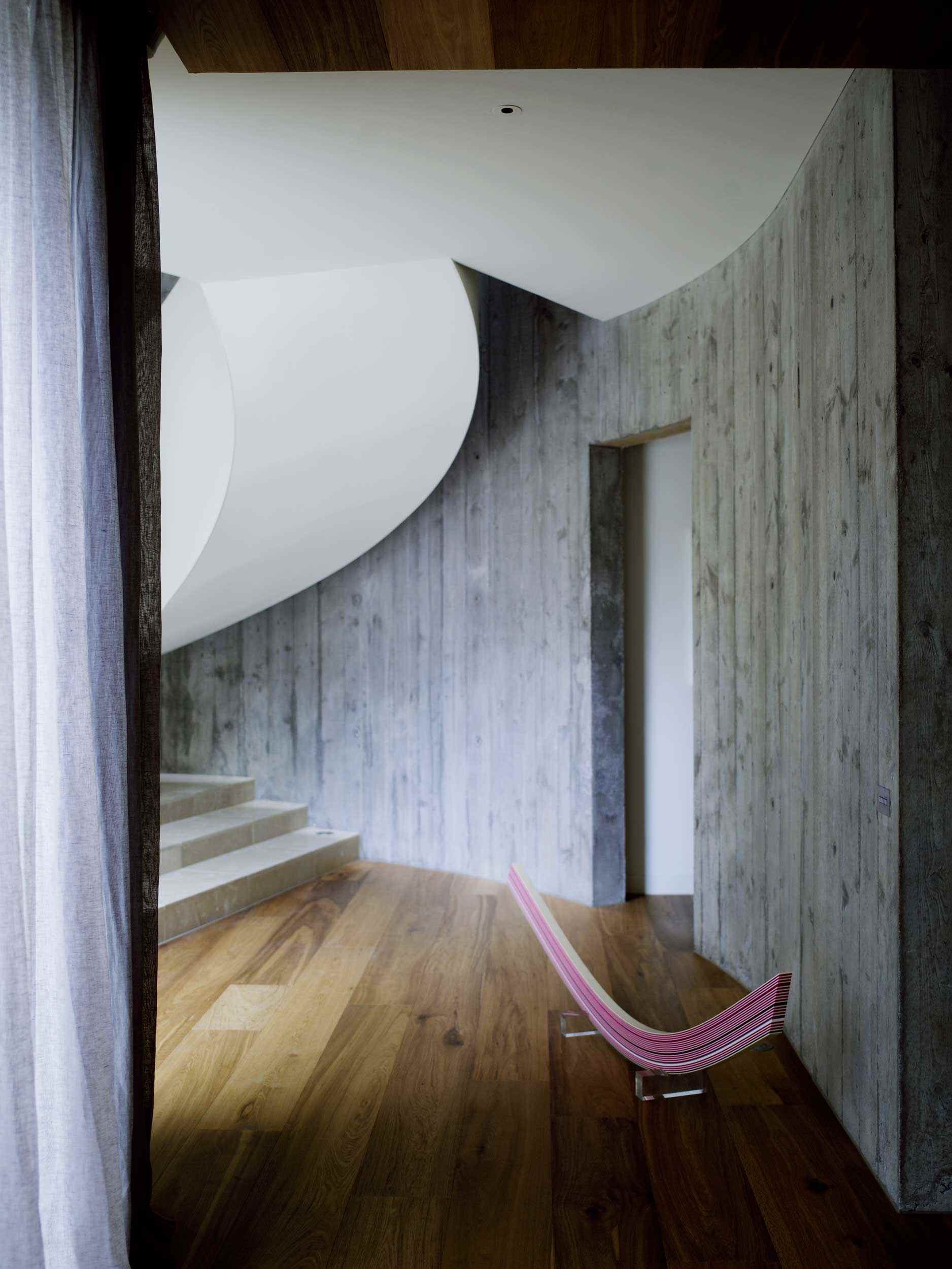 A dramatic entry down the wide stairway between curved retaining walls flanked either side by sunken Japanese gardens is like entering the silence of a natural ravine. This entrance conceals the generous and light filled interior and hidden private garden and pool beyond. Natural materials and beautiful off form concrete are the material palette and create both expansive and intimate spaces for both family and entertaining. A beautiful project.