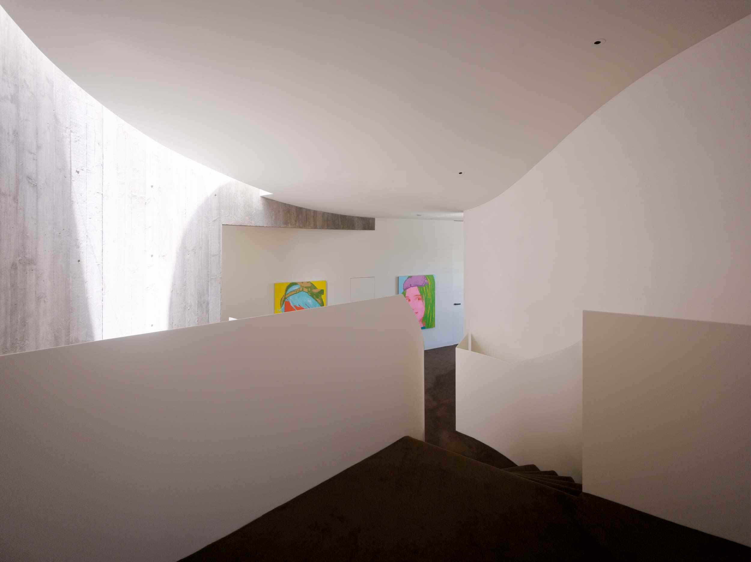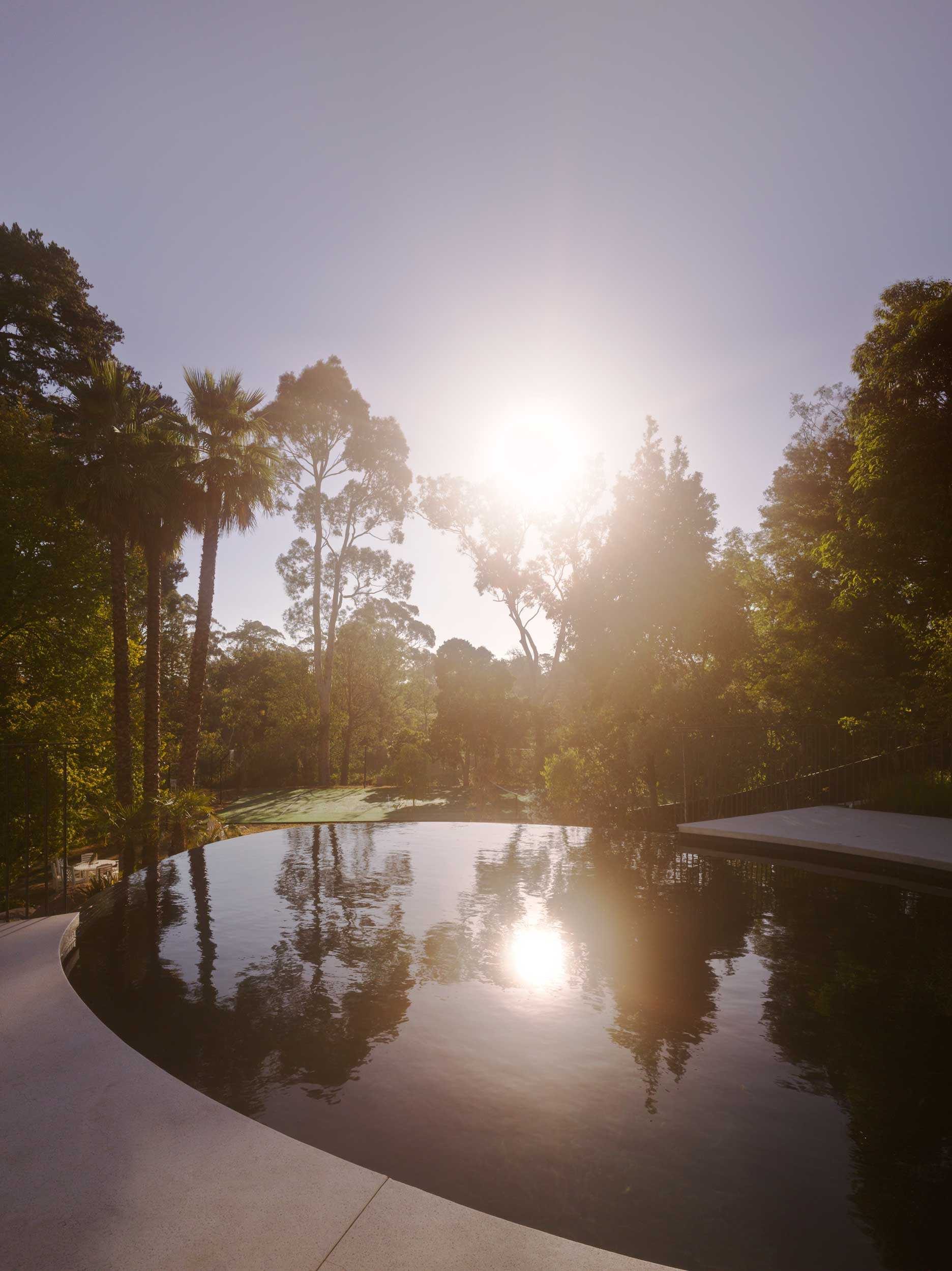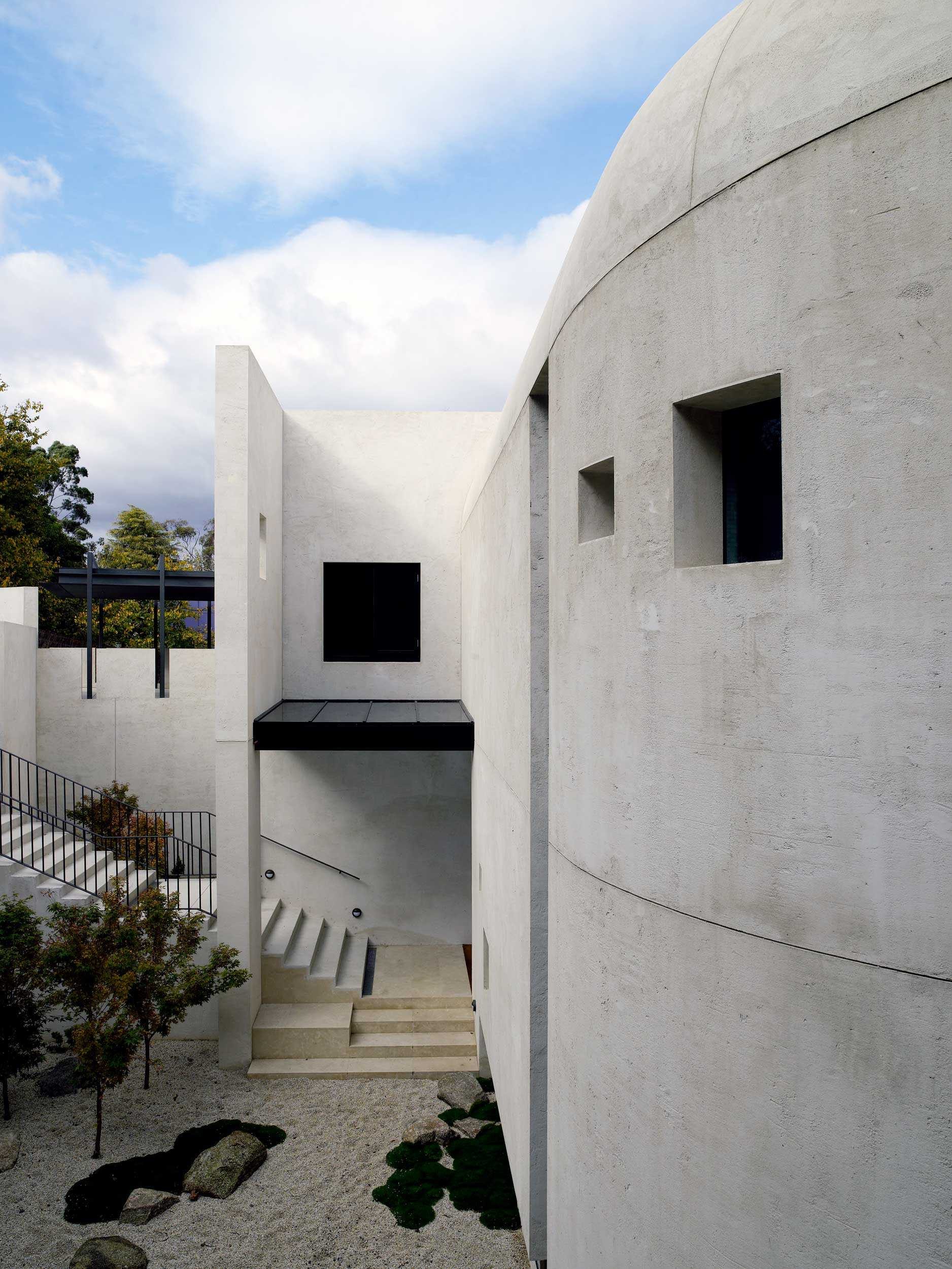 A dramatic entry down the wide stairway between curved retaining walls flanked either side by sunken Japanese gardens is like entering the silence of a natural ravine. This entrance conceals the generous and light filled interior and hidden private garden and pool beyond. Natural materials and beautiful off form concrete are the material palette and create both expansive and intimate spaces for both family and entertaining. A beautiful project.