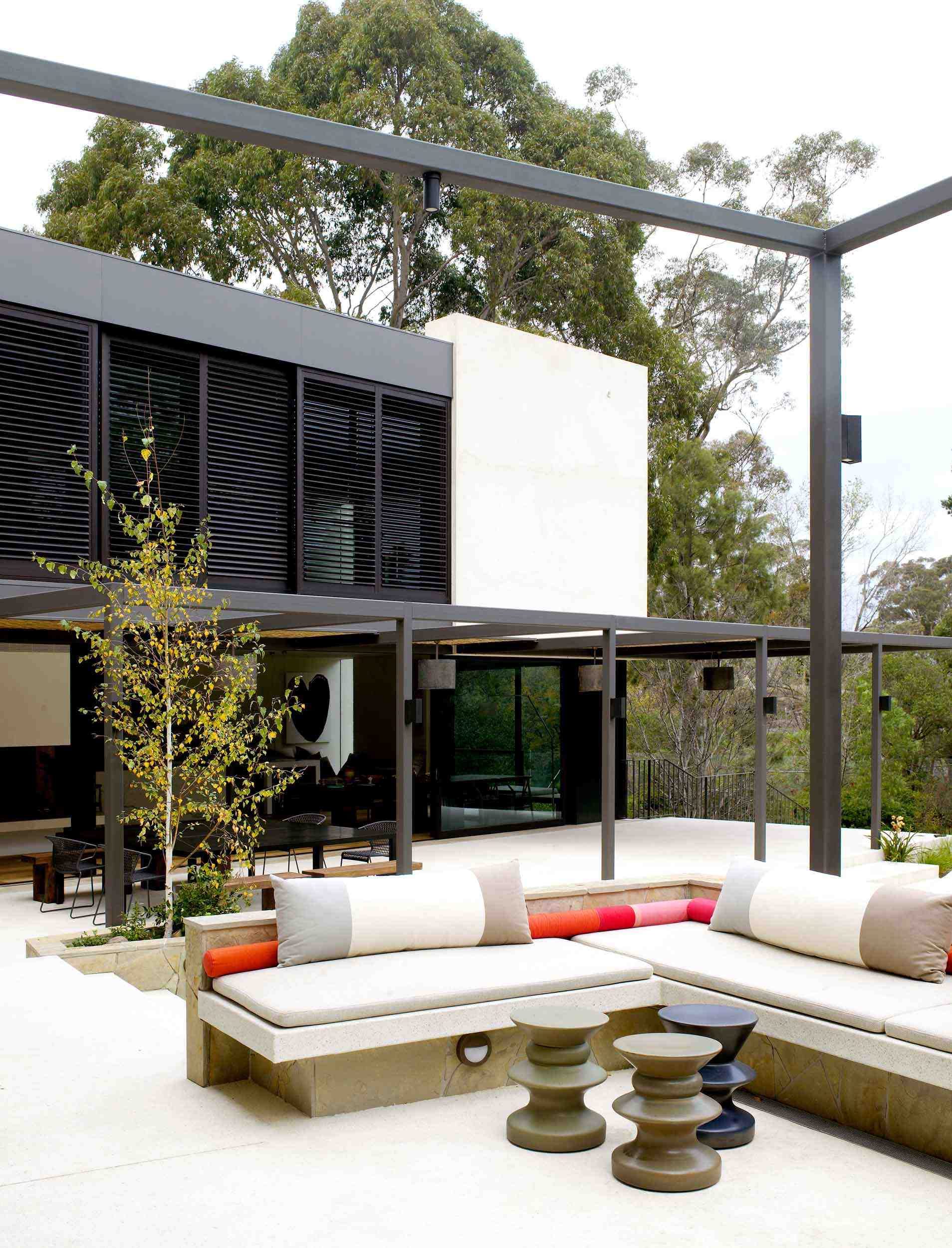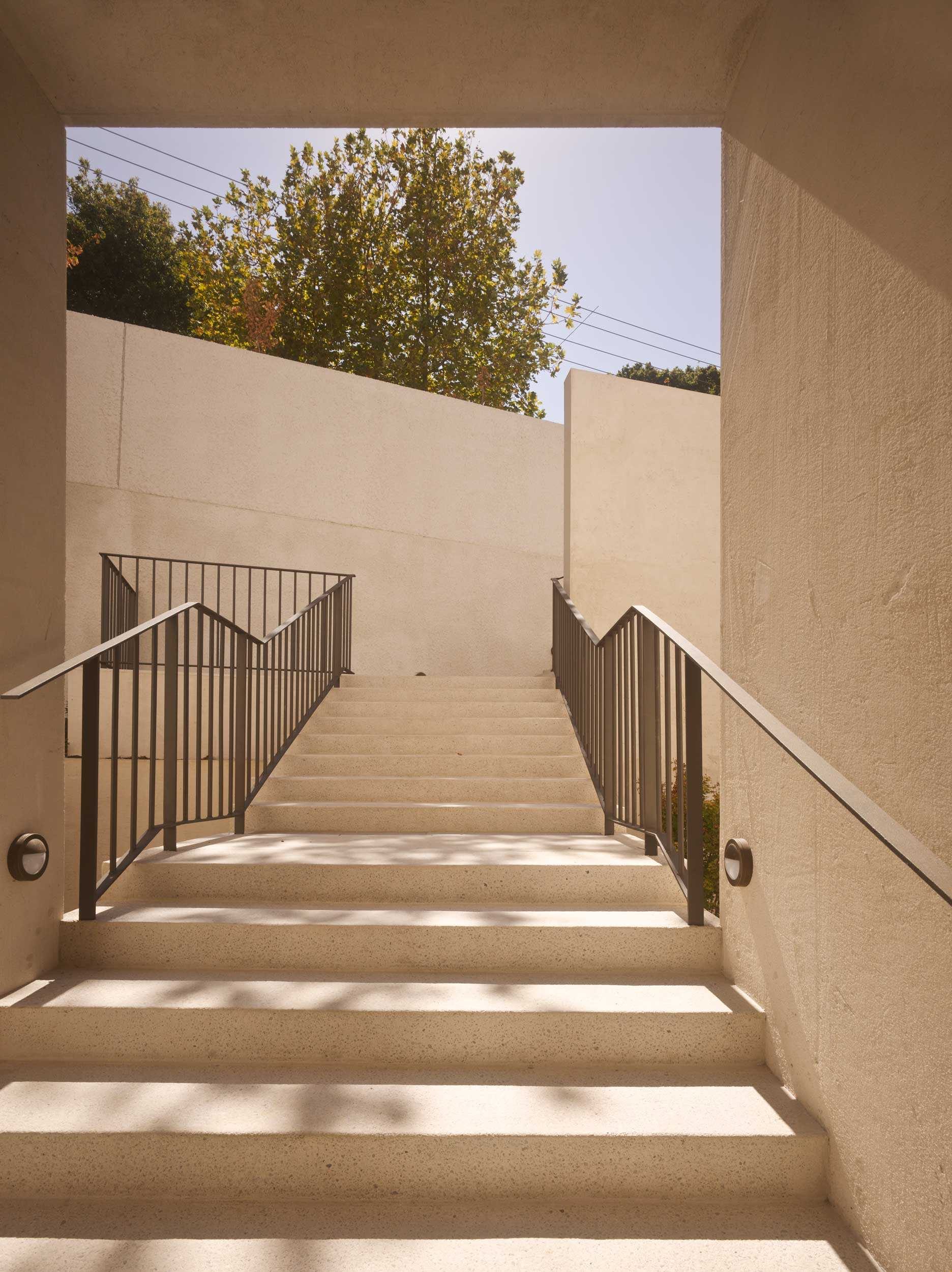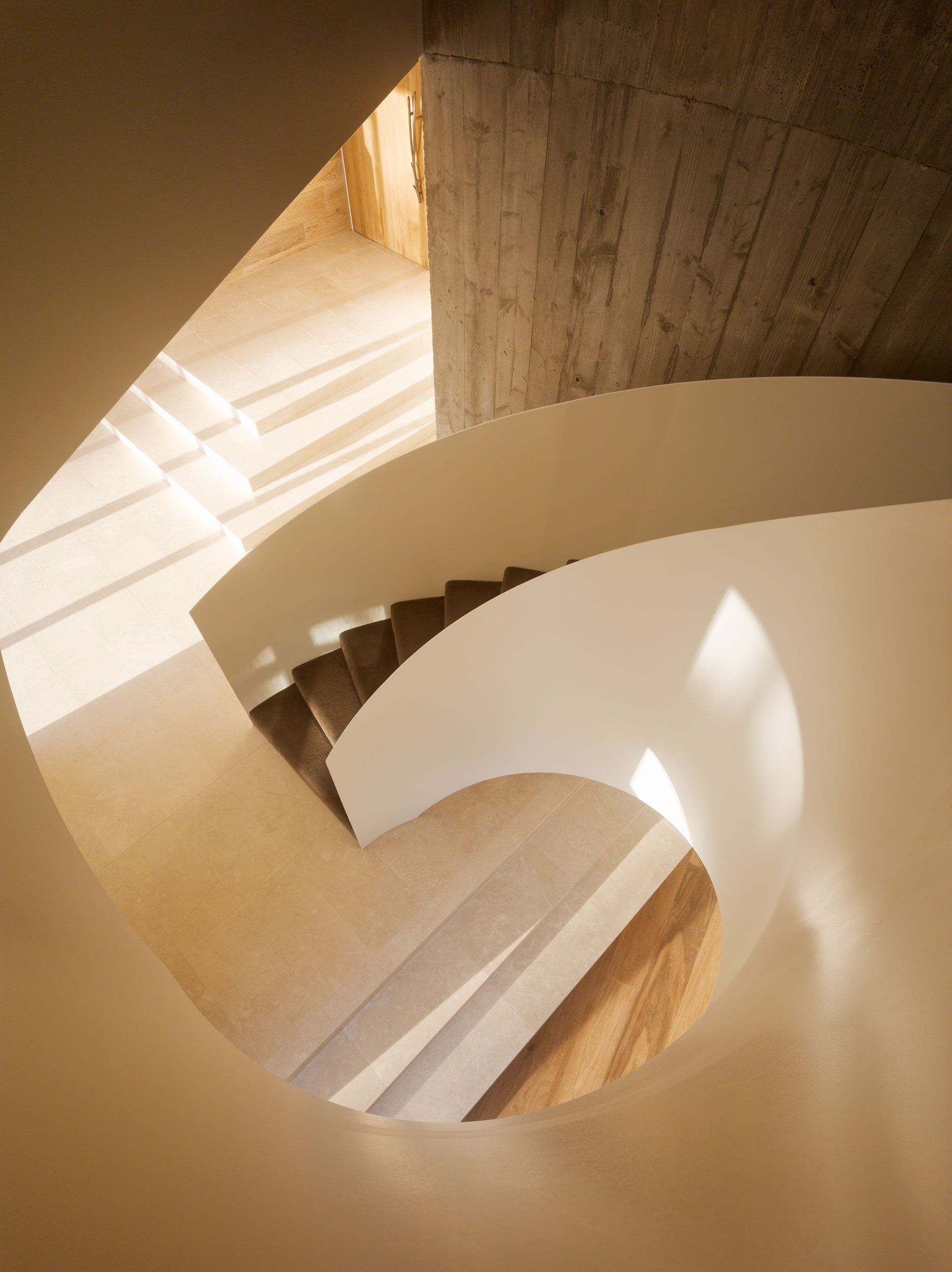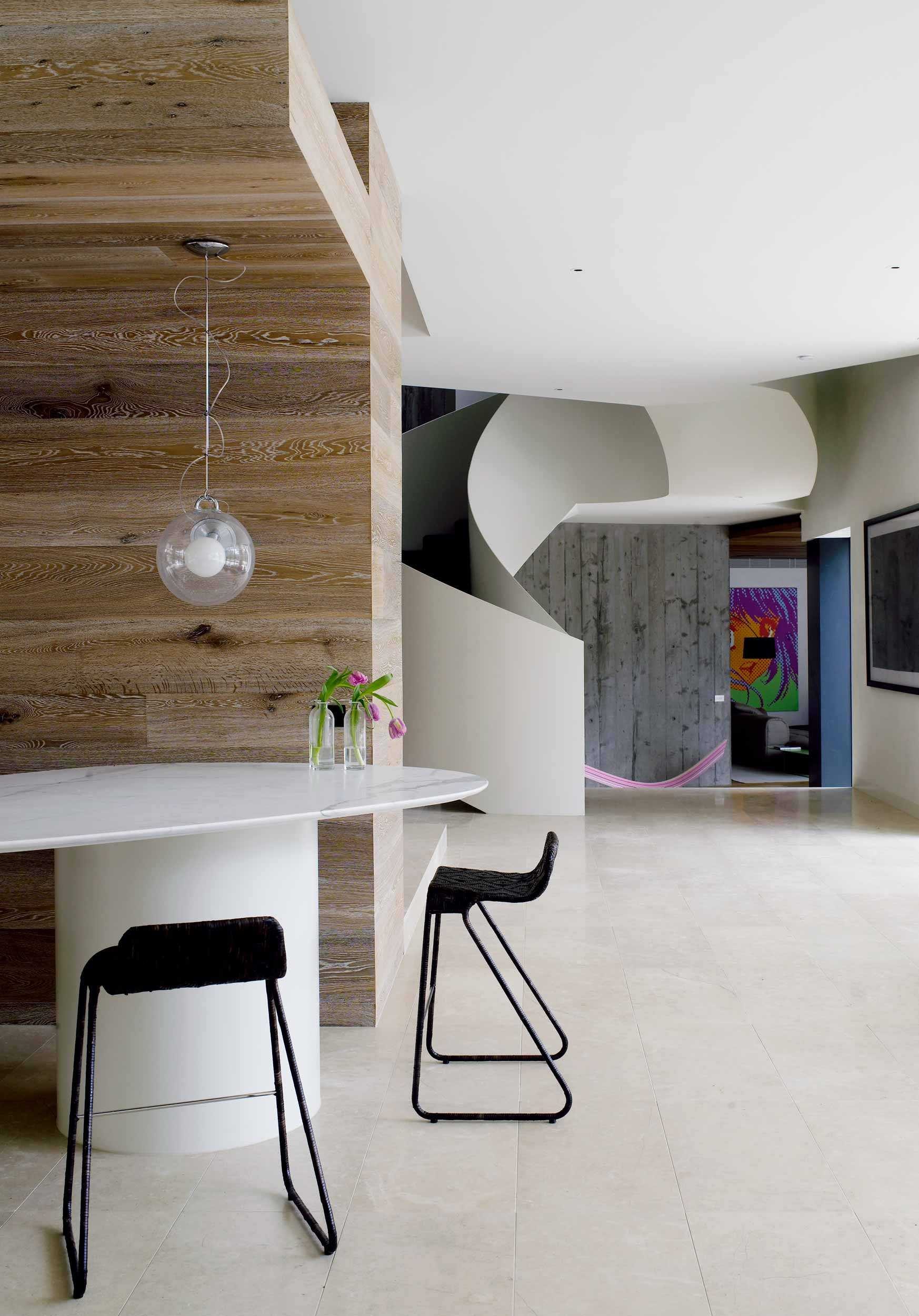 A dramatic entry down the wide stairway between curved retaining walls flanked either side by sunken Japanese gardens is like entering the silence of a natural ravine. This entrance conceals the generous and light filled interior and hidden private garden and pool beyond. Natural materials and beautiful off form concrete are the material palette and create both expansive and intimate spaces for both family and entertaining. A beautiful project.